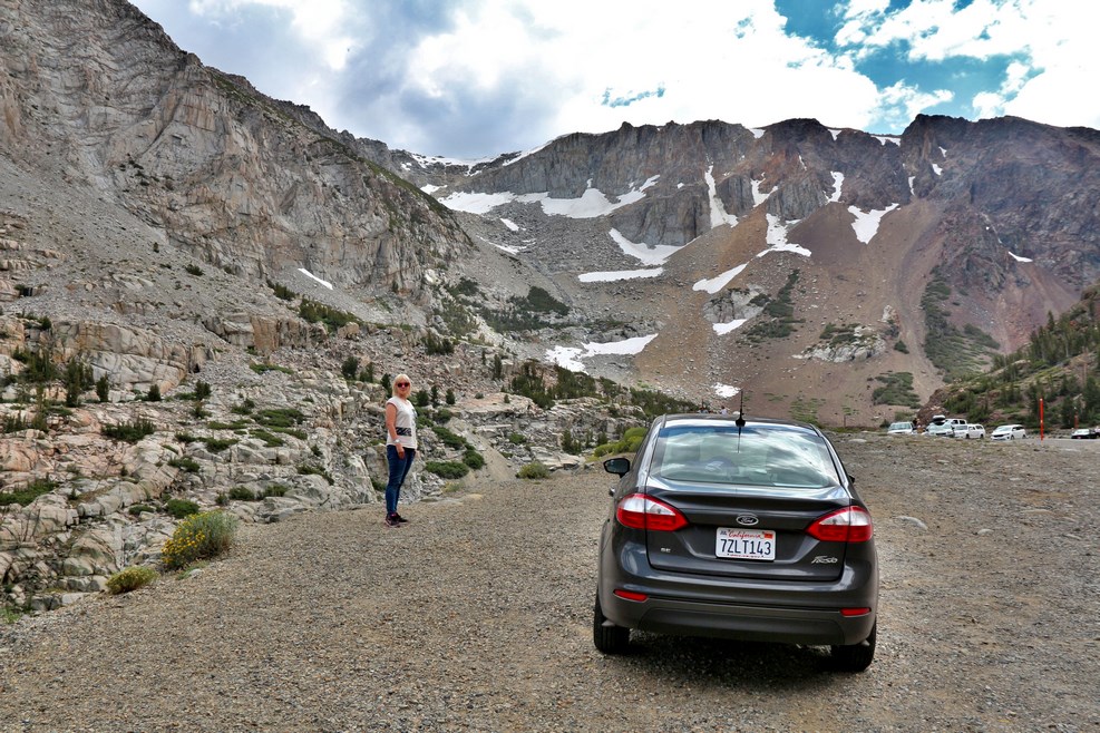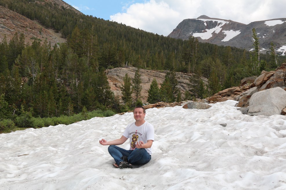 Удивительна природа Америки, еще 4 часа назад мы изнывали от жары в 50 градусов, а сейчас я спокойно медитирую сидя на снегу летом: