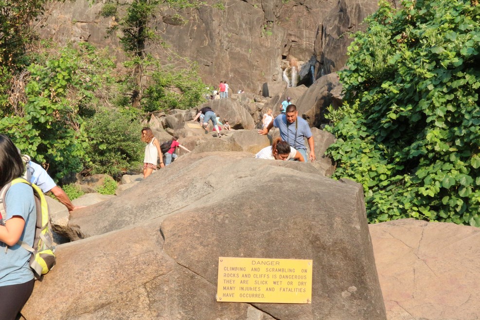 Люди лезут по камням поближе к водопаду. На камнях есть множество предупреждающих табличек, но они никого не останавливают. (Осторожно, камни скользкие. Высокий риск ранений и травм):