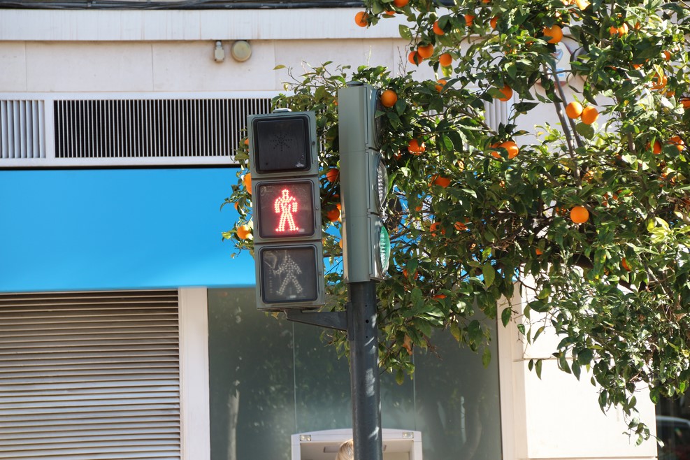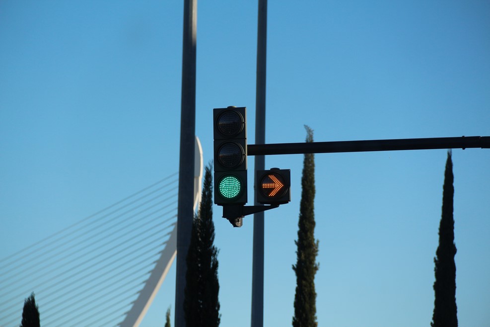 В Испании есть участки, где можно направо поворачивать на красный свет. Такие участки обозначены дополнительной секцией с желтой мигающей стрелкой: